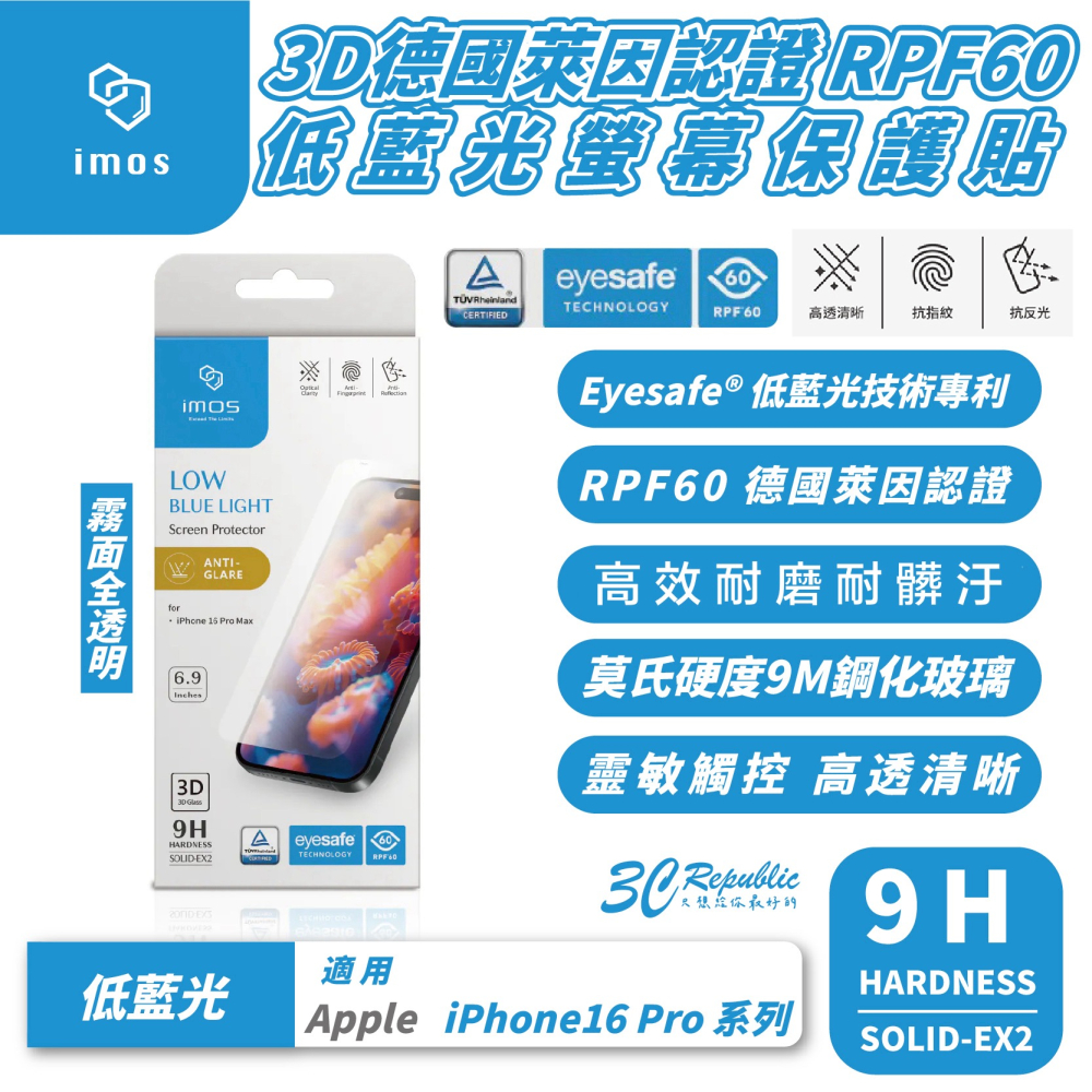 imos 3D 霧面 全透明 無黑邊 德國萊因 低藍光 保護貼 玻璃貼 9H 適 iPhone 16 Pro Max