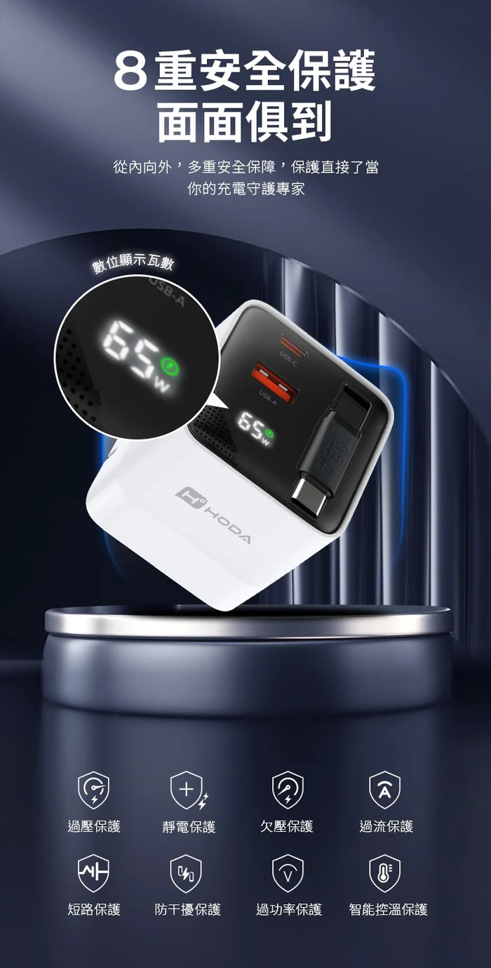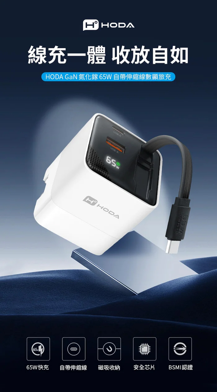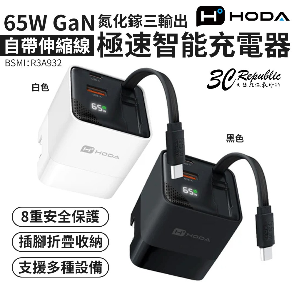 HODA GaN 氮化鎵 65w 三輸出 自帶 伸縮線 PD 充電頭 極速 iPhone 17 16 15 s25