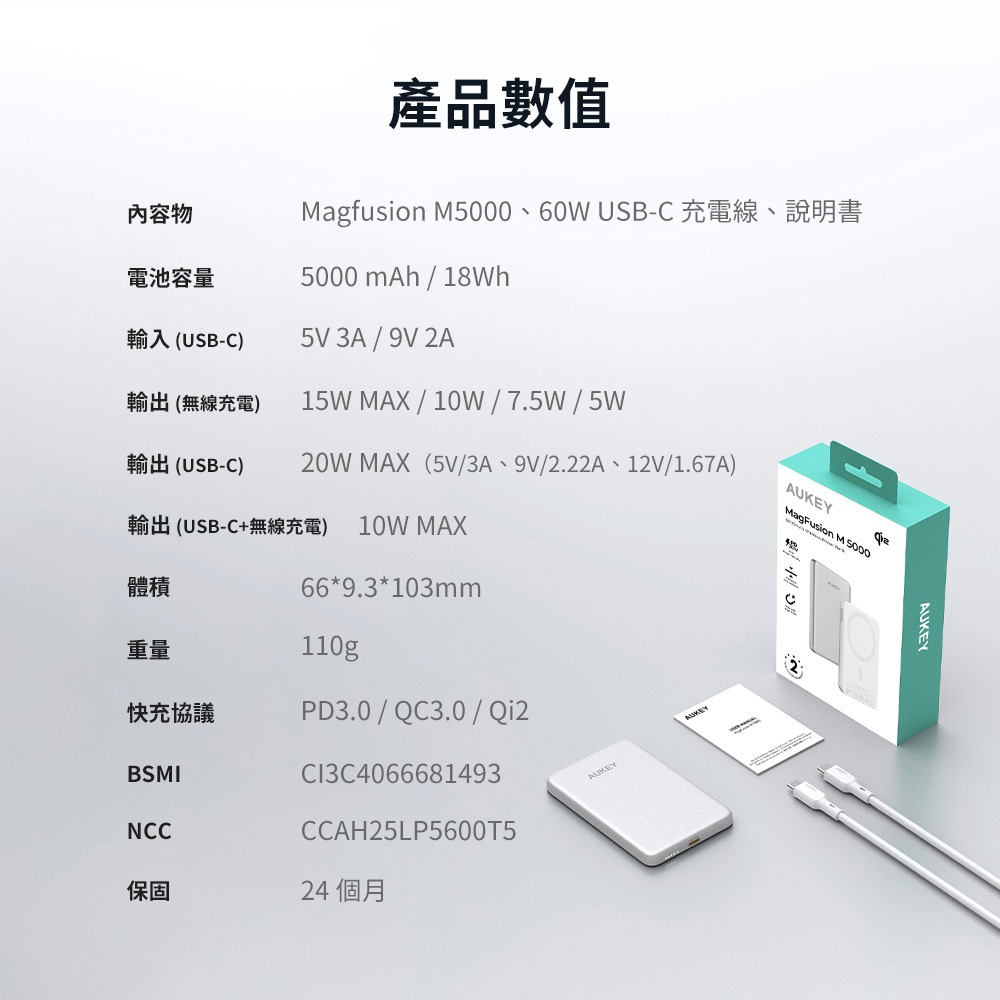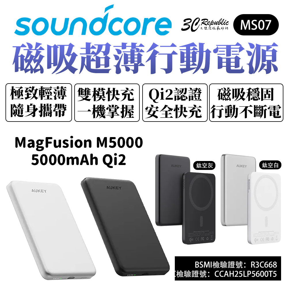 AUKEY M5000 5000mAh Qi2 磁吸 超薄 行動電源 MS07 適 iPhone 17 16 15