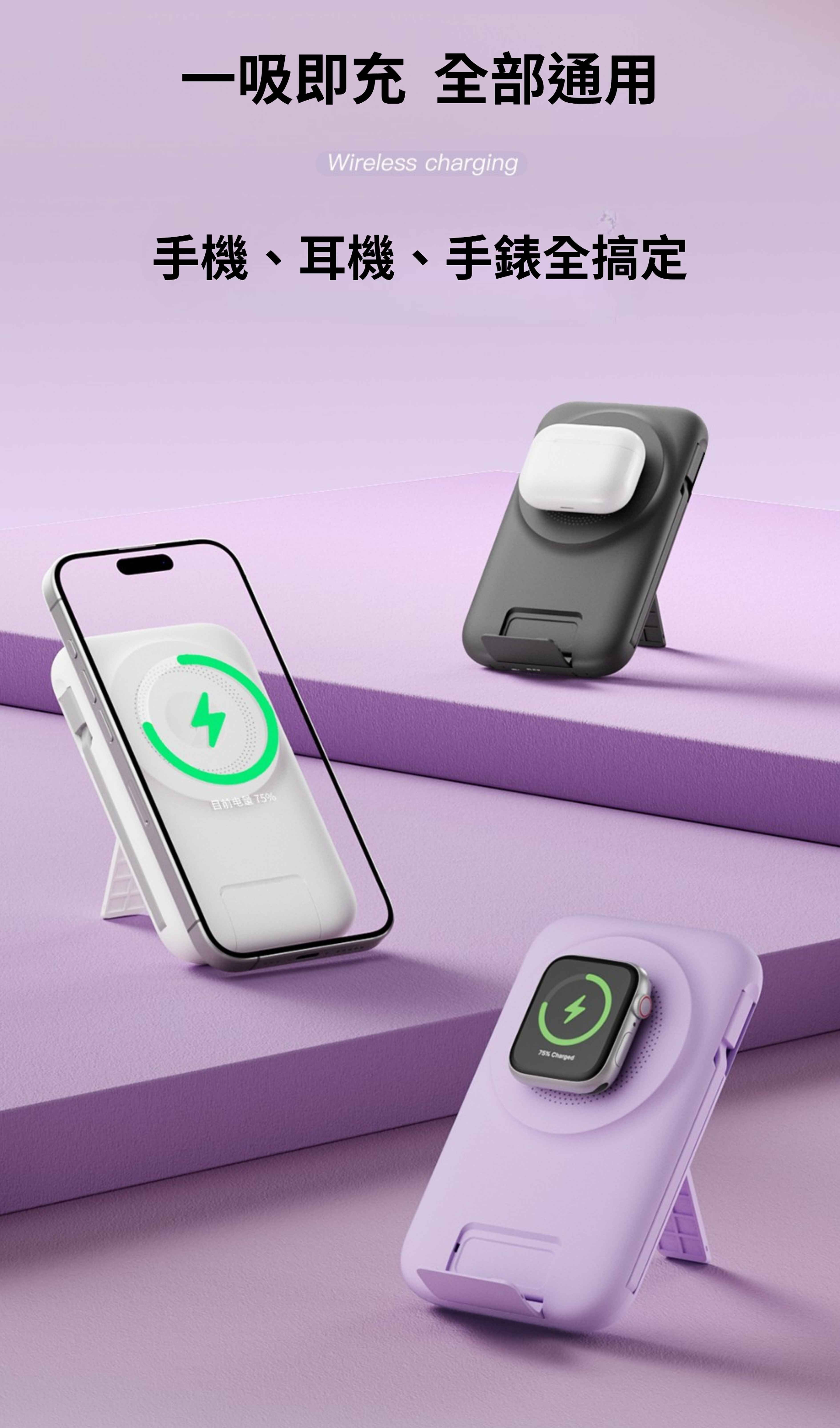 三合一磁吸無線充電:手機、耳機、手錶隨放即充。
