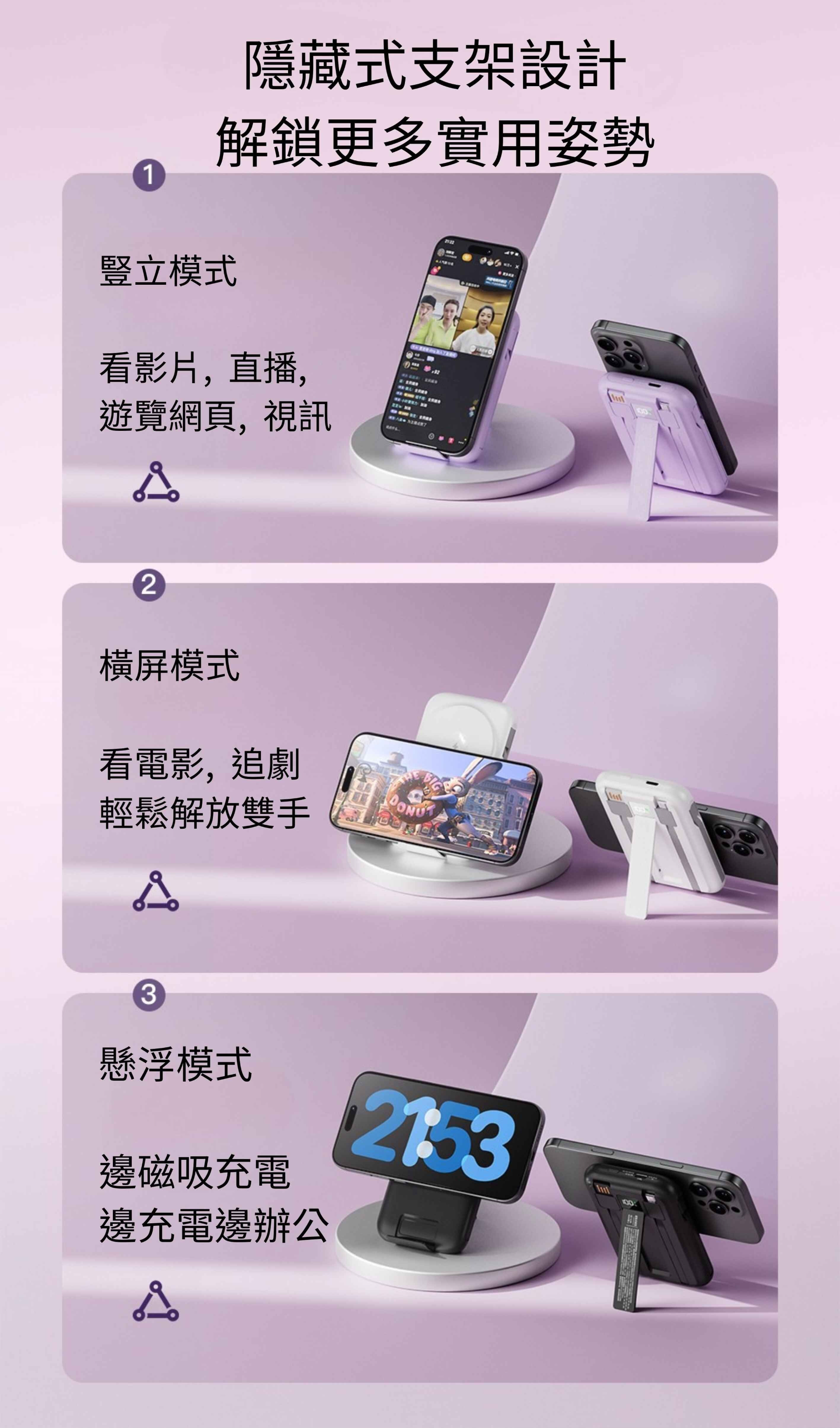 隱藏式雙折疊支架+數位電量顯示:多角度支撐+電量清晰,一目了然。