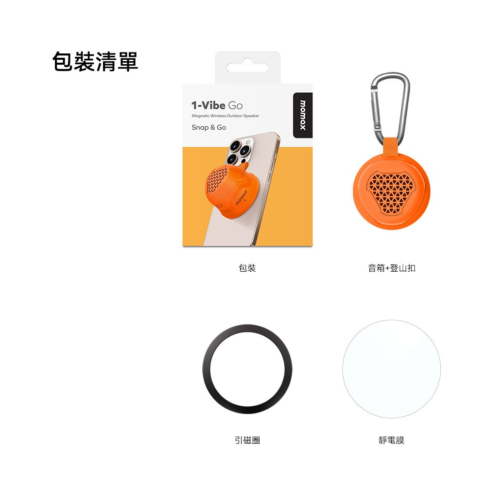 - 內容物:音箱×1、登山扣×1、引磁圈×1、靜電膜×1
