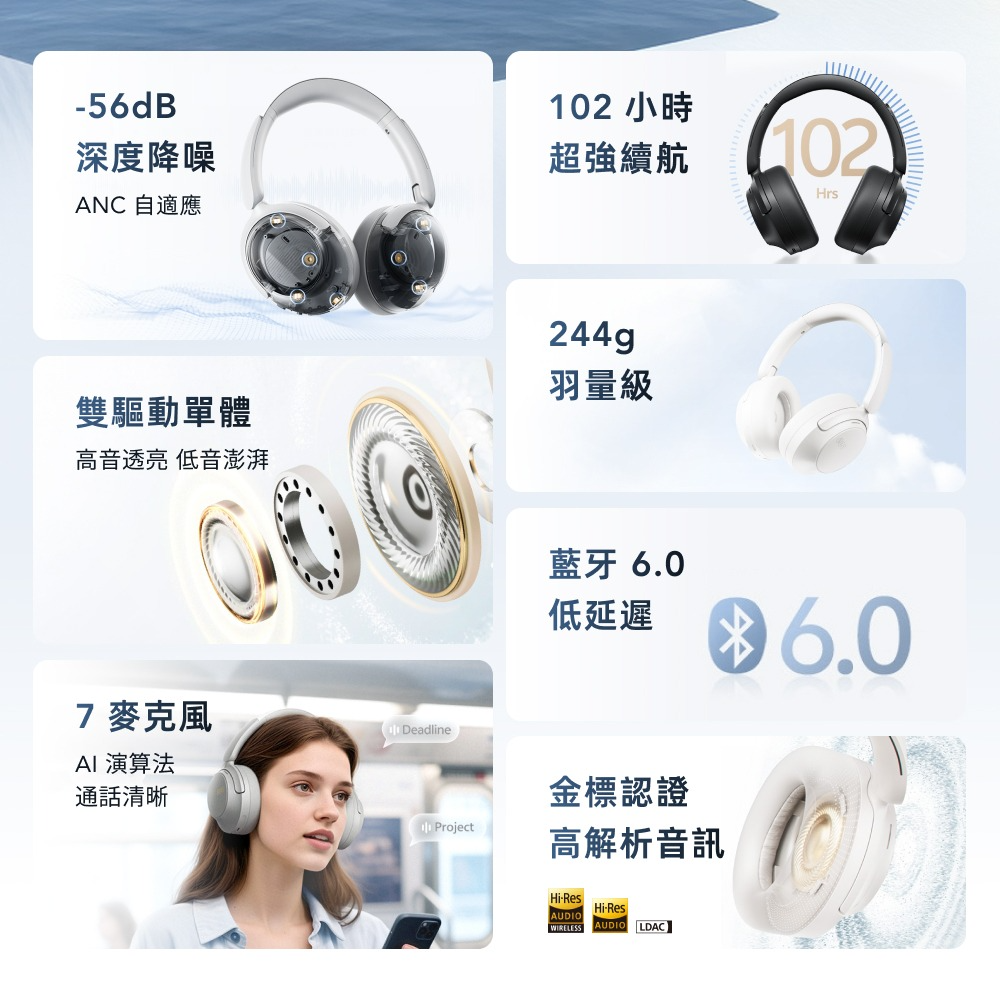56 dB深度降噪,Hybrid ANC + DNN 智慧判斷噪源,通勤、辦公、咖啡廳一鍵安靜,體感接近 90%噪音消除