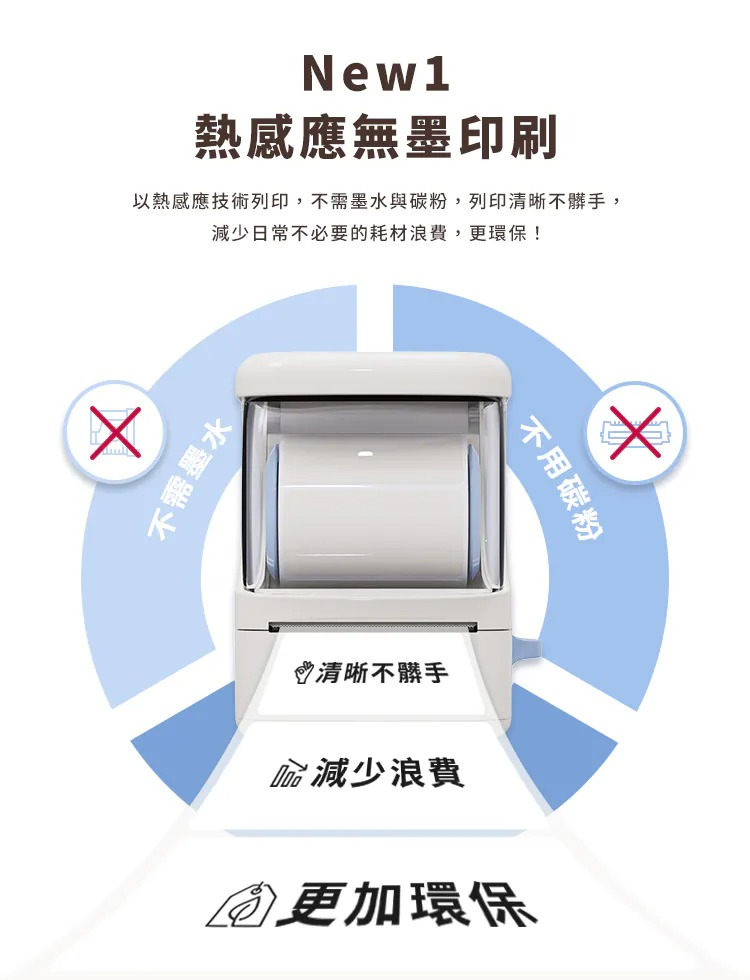 ・熱感應無墨印刷,無需墨水、不沾手,列印清晰省耗材