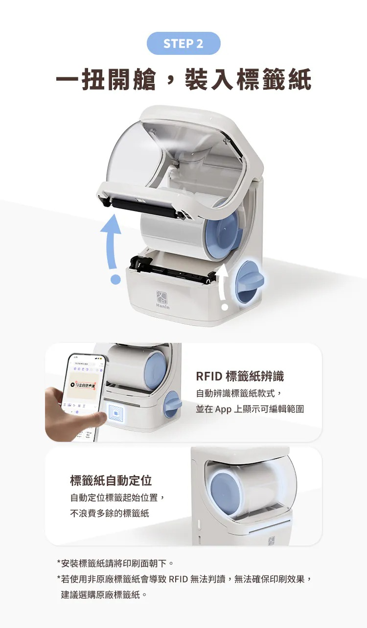 ・為確保印刷效果,建議選購原廠標籤紙,使用他牌標籤紙可能導致 RFID 無法判讀