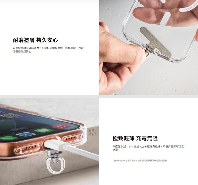 - 厚度僅 0.29 mm,支援 Apple 原廠充電線,不需拆卸即可正常充電