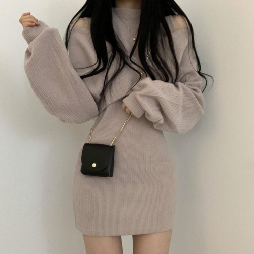 新款韓系INS修身顯瘦氣質坑條蓬蓬袖連衣裙 蓬蓬袖連身裙 兩件式 洋裝 女生洋裝 連身洋