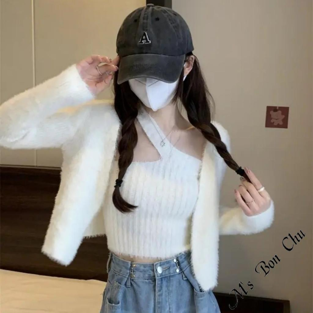 秋冬新款韓系INS休閒百搭斜肩長袖露肩上衣 開衫外套 兩件式上衣 背心外套 女生套裝 露肩