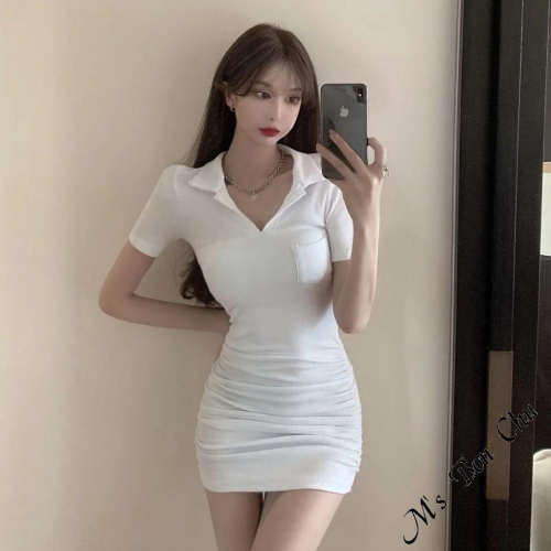春夏新款修身顯瘦韓系性感貼身抓皺連衣裙 翻領連身裙 短袖小洋裝 連體裙 短洋裝 Bonchu