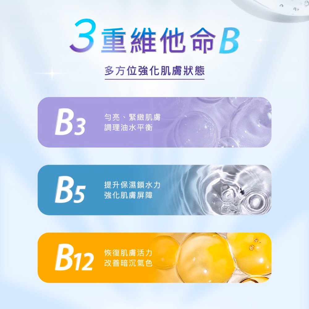 ◉B5具有滲透保濕水潤及鎖水修護◉B3勻亮膚色改善暗沉◉B12恢復肌膚活力能量
