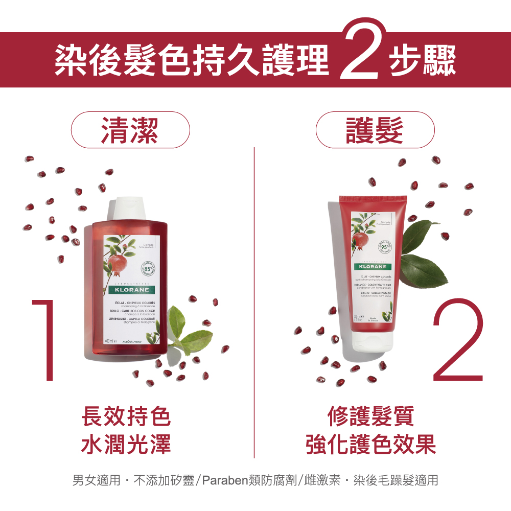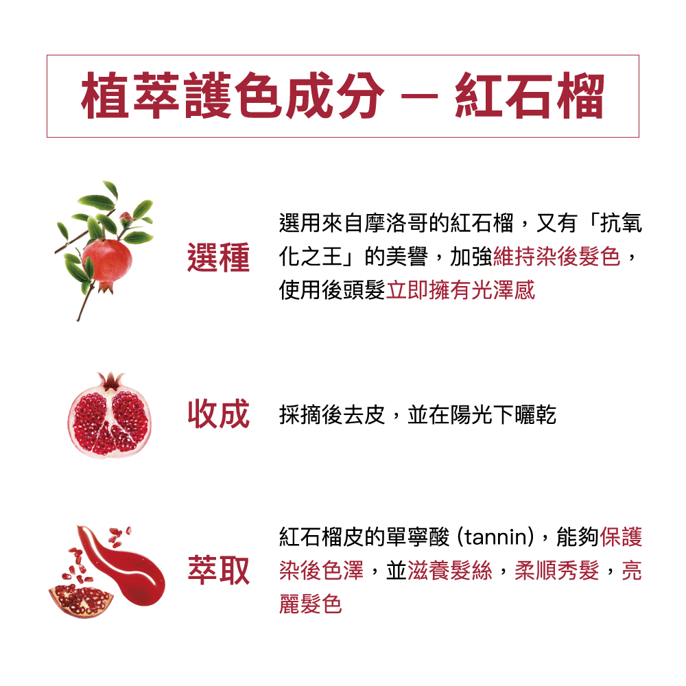 ◉紅石榴萃取,加強維持髮色◉撫平毛鱗片,修護受損髮質,減少毛躁不打結◉清甜花果香調,強韌髮絲,恢復柔順與彈性,使用後頭髮立即擁有光澤感。