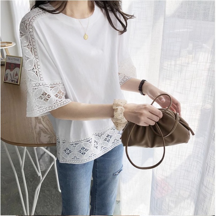 日系精緻圓領五分袖針織2023夏新款鏤空蕾絲拼接透氣T恤上衣
