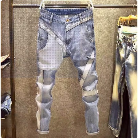 時尚春秋款牛仔褲男潮牌破洞補丁彈力修身小腳個性撞色拼接百搭褲子男