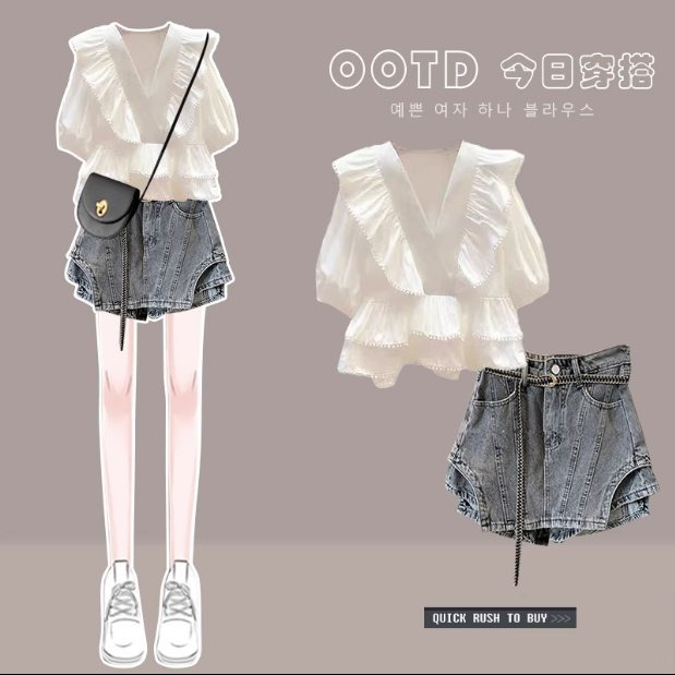 韓劇別致休閒套裝女夏季2023新款白色小個子襯衫牛仔短褲裙兩件套