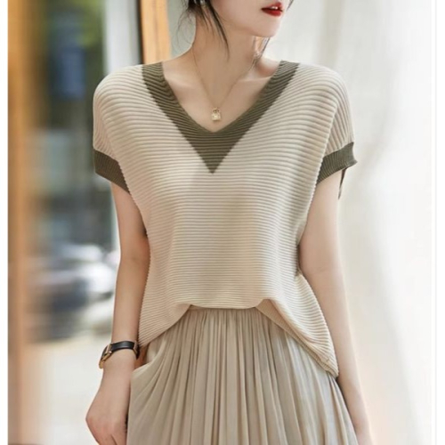 夏季短袖T恤女V領寬鬆冰絲針織衫胖妹妹上衣2023韓版減齡顯瘦女裝