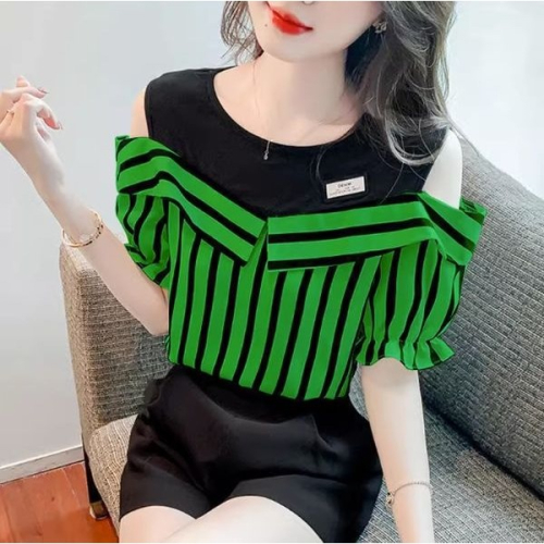 大碼法式氣質露肩新款條紋假兩件襯衫女夏設計感小眾別致短袖上衣