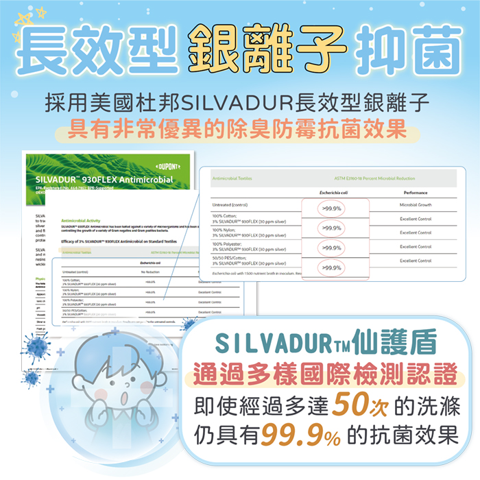 ✓美國杜邦SILVADUR長效型銀離子 , 優異的除臭防霉抗菌效果