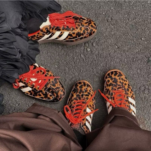 鞋面呈現獨特豹紋圖騰,並採用馬毛材質,帶來強烈視覺衝擊與奢華觸感。搭配經典三條紋設計與搶眼的紅色鞋帶,完美融合復古與街頭潮流元素。