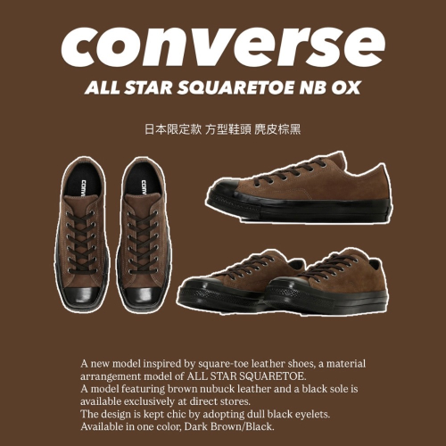 以方頭皮鞋為靈感的新款式 ALL STAR SQUARETOE,推出了材質變化的版本。這次直營店限定發售的型號,採用了 棕色的麂皮皮革搭配黑色鞋底。並使用暗黑色鞋眼孔,營造出沉穩高雅的設計感。