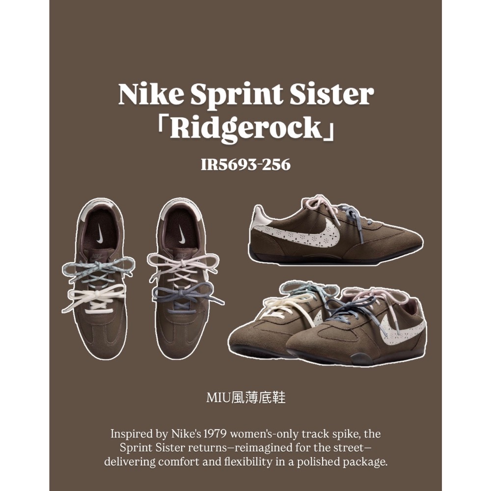 Nike Sprint Sister 以現代低筒鞋型重塑 1979 年經典女子田徑鞋款,線條俐落優雅,帶有近似芭蕾舞鞋的輕盈氣質。鞋身採用極簡帆布搭配麂皮結構,大面積覆蓋大地色系「Ridgerock」。乾淨俐落的「Sail」白色 Swoosh 橫掃鞋側,輔以細緻鏤空小圖案與花紋,為整體增添若有似無的層次質感。設計最後以環繞式橡膠外底收結,並在後跟與鞋頭略微延伸包覆,同樣以「Ridgerock」呈現,同步強化耐用度與造型張力。