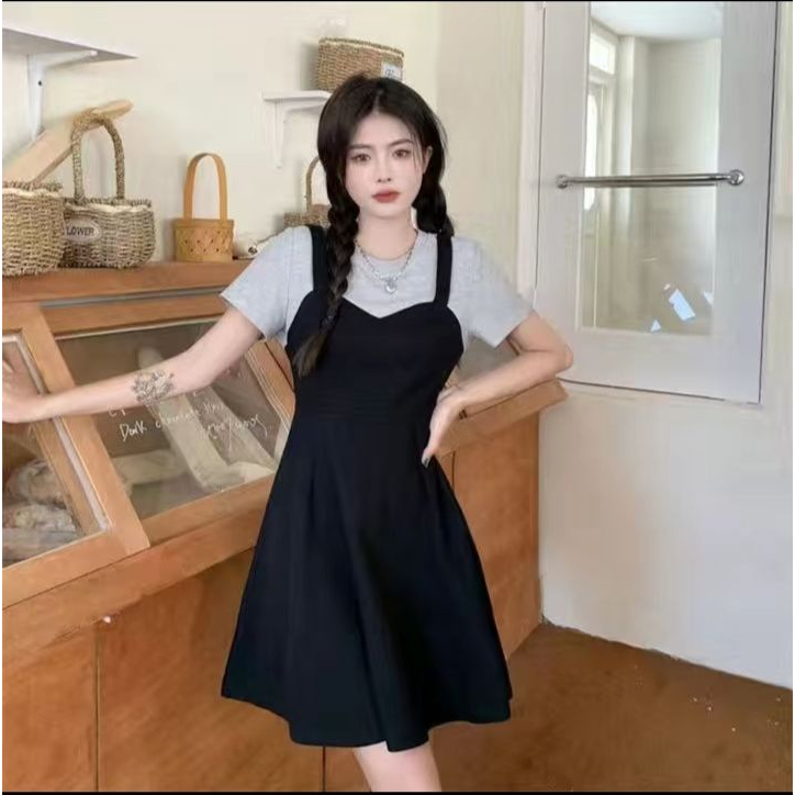 显瘦甜美大码胖mm小众设计灰拼黑假两件吊带连衣裙女