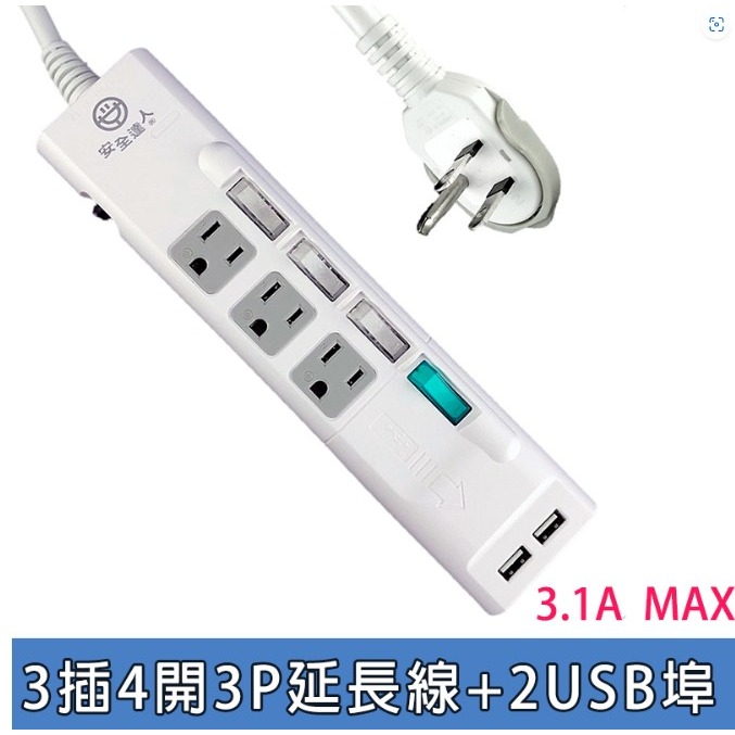 ◆產品名稱:安全達人3P電腦延長線(3插4開)+2USB-3.1A延長線1.8米