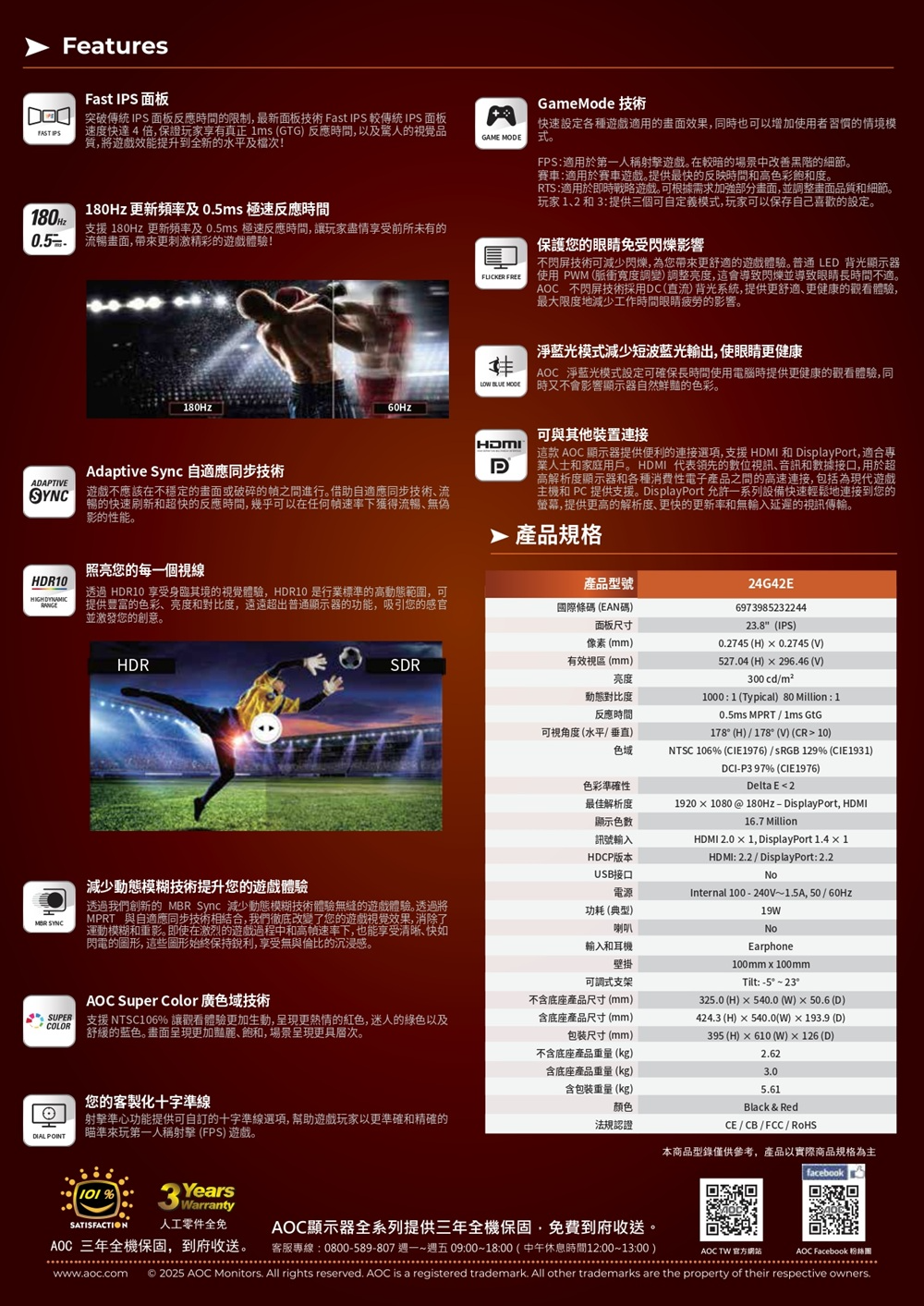 AOC C27G4Z 電競螢幕(27型/FHD/HDR/280Hz/0.3ms/VA)