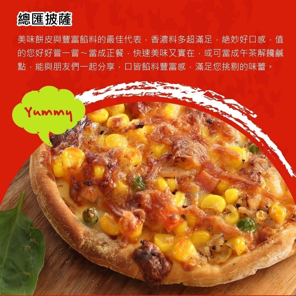 總匯披薩成分:成份:麵粉、乳酪絲(乾酪、棕櫚油、酪蛋白、黏稠劑(醋酸澱粉、鹿角菜膠)、調味劑(氯化鉀)、鹽、調味劑(檸檬酸鈉)、品質改良劑(磷酸鈉、多磷酸鈉)、乳清粉、奶粉、調味劑(檸檬酸)、馬鈴薯澱粉(外灑粉)、大豆沙拉油、色素(黃梔子、婀娜多))、玉米粒、蕃茄醬(水、砂糖、蕃茄糊、麥芽糖、乙醯化已二酸二澱粉、鹽、調味劑(檸檬酸、DL-蘋果酸)、玉米糖膠、多磷酸鈉、異抗壞血酸鈉(抗氧化劑)、已二烯酸鉀(防腐劑)、甜菊糖苷(甜味劑)、食用紅色六號)、培根(豬肉-加拿大、雞肉、分離大豆蛋白(非基因改造)、玉米澱粉、鹽、蛋白粉、砂糖、月桂葉、麥芽糊精、醬油、洋蔥粉、香料)、火腿(豬肉-加拿大、大豆蛋白、糖、鹽、麥芽糊精、胡椒粉、保色劑(鹽、檸檬酸鈉、碳酸鈉、氯化鉀、DL-胺基丙酸)、肉精粉(香料、L-天門冬酸鈉、胺基乙酸、呈味核苷酸二鈉(5'-鳥嘌呤核苷磷酸二鈉、5'-次黃嘌呤核苷磷酸二鈉)、琥珀酸二鈉、五香粉(肉桂、八角、陳皮、小茴、花椒、丁香)、抗氧化劑(異抗壞血酸鈉)、保色劑(亞硝酸鈉、硝酸鉀))、青豆仁、紅蘿蔔、糖、大豆沙拉油、洋蔥、鹽、酵母(酵母、大豆油、乳化劑(山梨醇酐單硬脂酸酯)、抗氧化劑(維生素C)、阿拉伯膠)、黑胡椒。