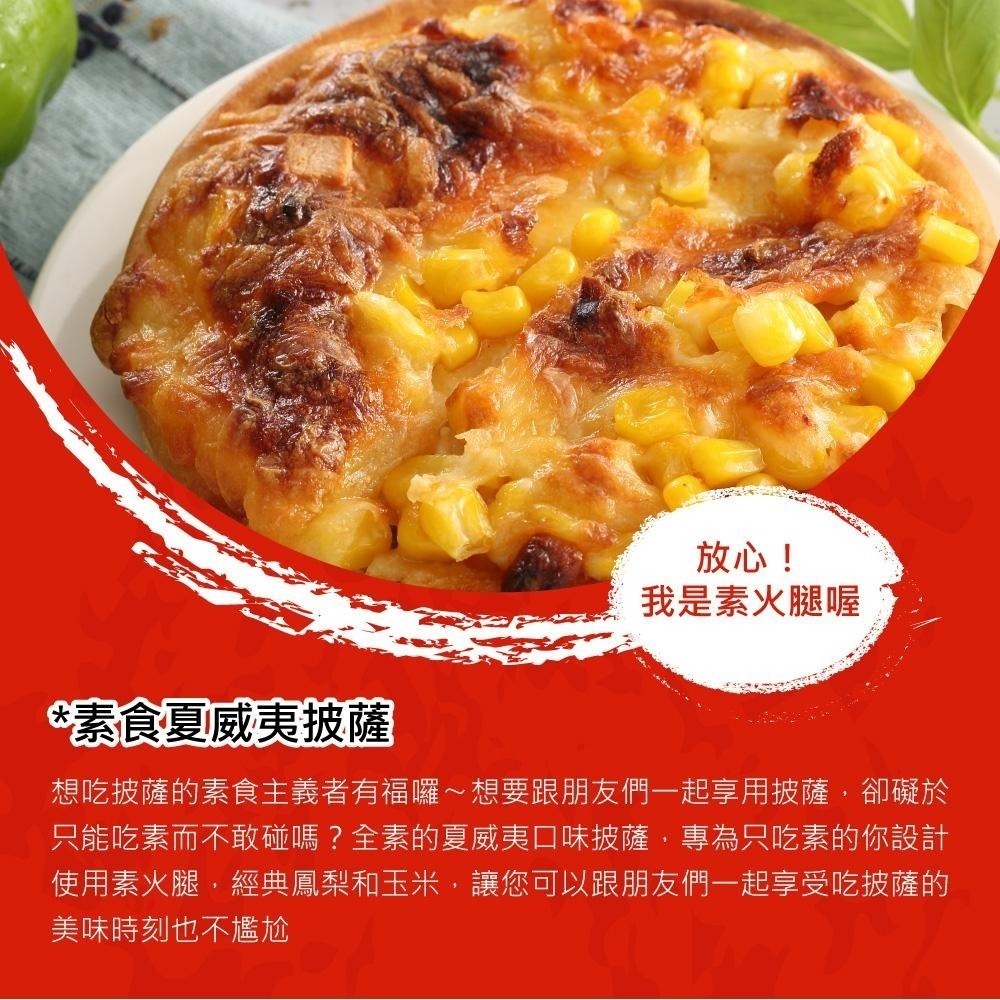 素食夏威夷披薩成分:成份:麵粉、乳酪絲(乾酪、棕櫚油、酪蛋白、黏稠劑(醋酸澱粉、鹿角菜膠)、調味劑(氯化鉀)、鹽、調味劑(檸檬酸鈉)、品質改良劑(磷酸鈉、多磷酸鈉)、乳清粉、奶粉、調味劑(檸檬酸)、馬鈴薯澱粉(外灑粉)、大豆沙拉油、色素(黃梔子、婀娜多))、玉米粒、鳳梨、蕃茄醬(水、砂糖、蕃茄糊、麥芽糖、乙醯化已二酸二澱粉、鹽、調味劑(檸檬酸、DL-蘋果酸)、玉米糖膠、多磷酸鈉、異抗壞血酸鈉(抗氧化劑)、已二烯酸鉀(防腐劑)、甜菊糖苷(甜味劑)、食用紅色六號)、素火腿(水、組織狀大豆蛋白(非基因改造)(大豆、麩質)、大豆油、分離大豆蛋白(非基因改造)(大豆)、醬油(大豆、麩質)、二砂、修飾澱粉(醋酸澱粉)、素食調味料(L-麩酸鈉、甘草素(甜味劑)、DL-胺基丙酸、5'-次黃嘌呤核苷磷酸二鈉、5'-鳥嘌呤核苷磷酸二鈉、琥珀酸二鈉)、素食香料、碘鹽、紅麴米粉)、糖、大豆沙拉油、鹽、酵母(酵母、大豆油、乳化劑(山梨醇酐單硬脂酸酯)、抗氧化劑(維生素C)、阿拉伯膠)。