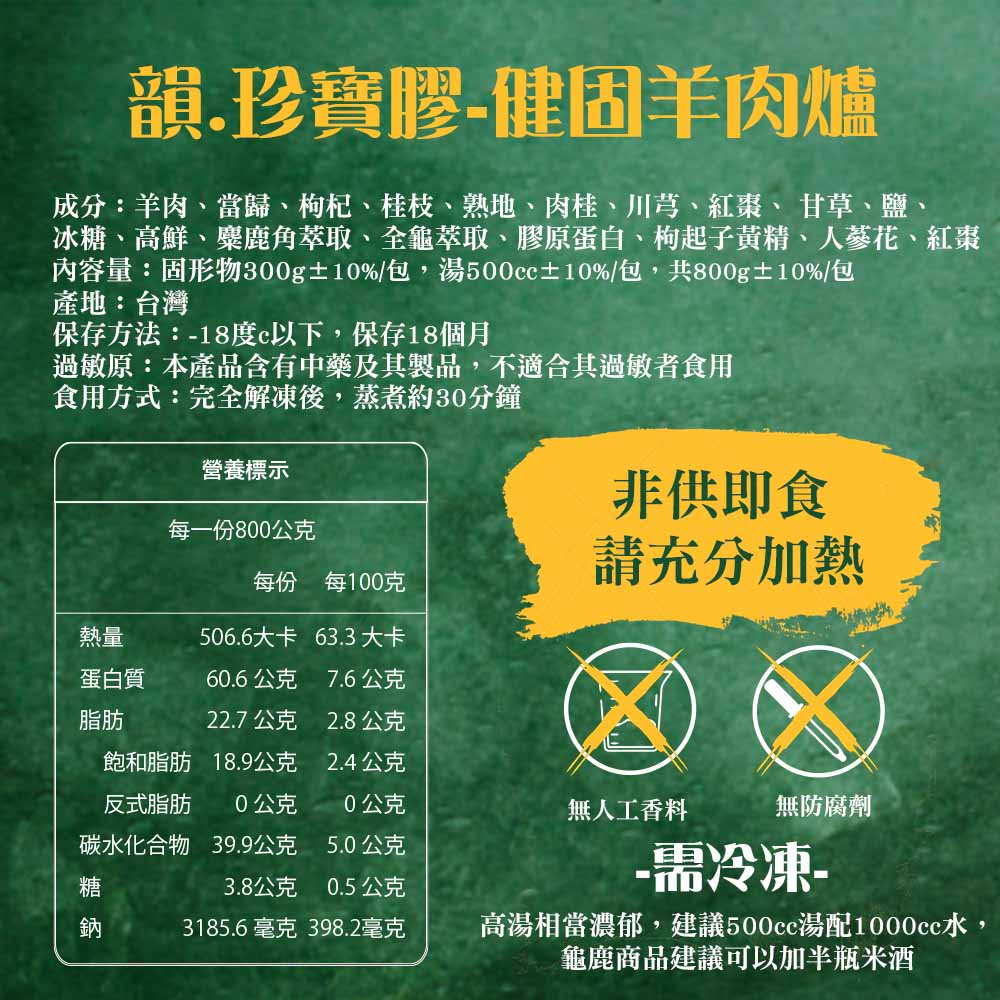 1.商品組合/規格:韻珍寶嚴選羊肉爐1包(800g±10%/包 )