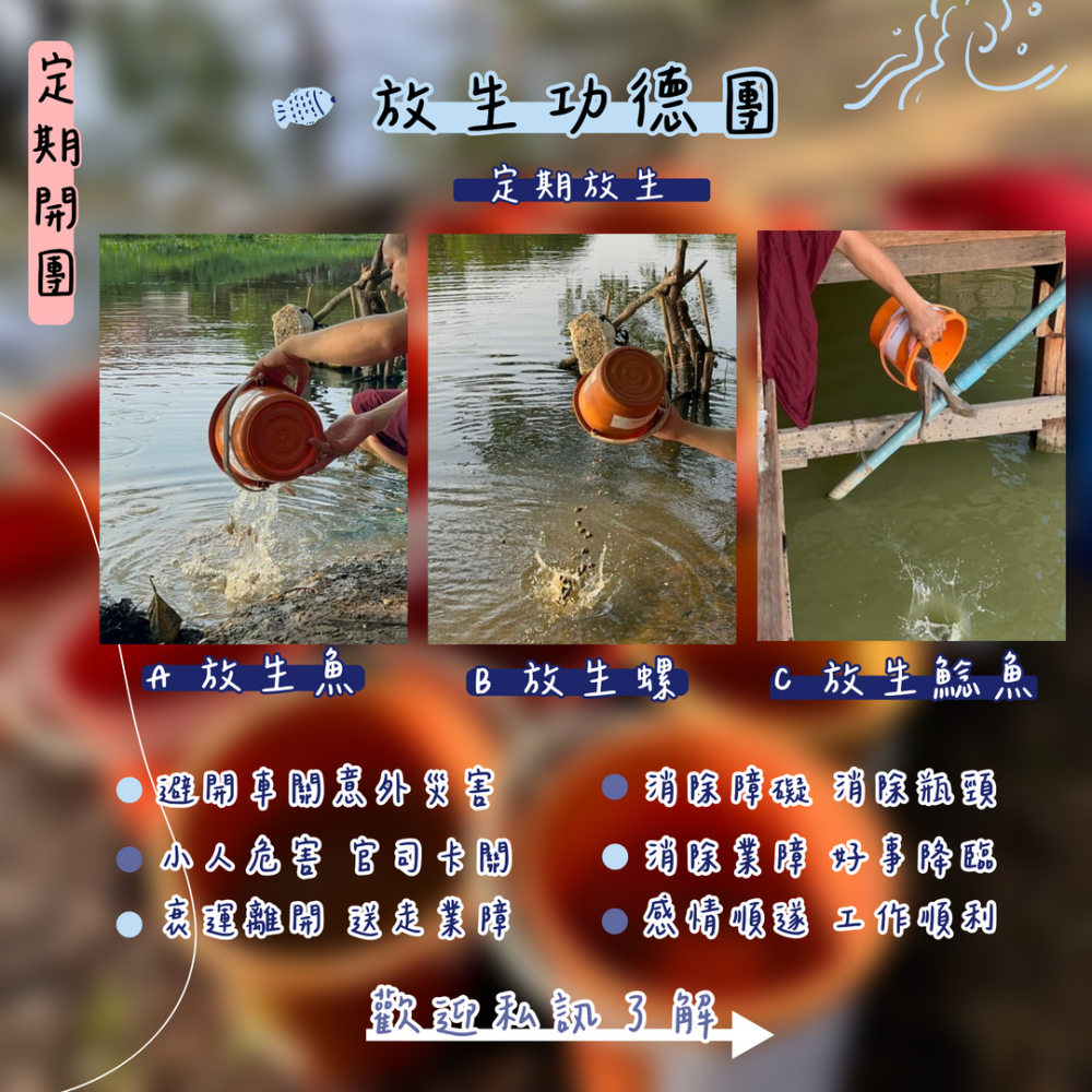 C)放生鯰魚主要針對避開車關,意外災害,小人危害,官司,消除瓶頸障礙等等。