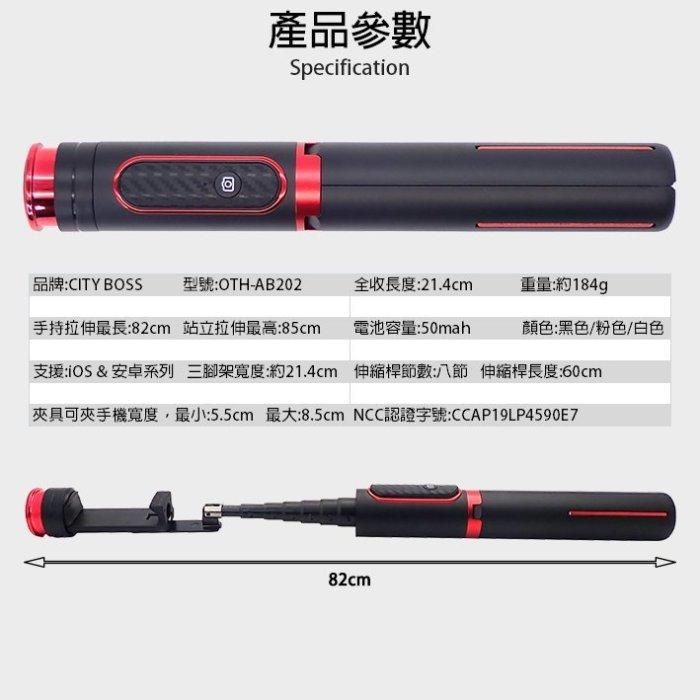 CITY BOSS 升級版手機多功能 自拍三腳架 自拍神器 直播支架 拍照神器 自拍桿 自拍棒 .顏色:黑色、粉色  .材質:ABS+鋁合金  .配置:藍牙遙控器  .拉伸長度:720mm  .收納長度:約214mm  .重量:184g NCC認證字號:CCAP19LP4590E7 【雲台版】魅影藍牙自拍棒鋁合金自拍桿三腳架 超迷你 神收納 簡約時尚自拍棒 手機自拍桿自拍神器手機自拍棒 是一款一體式伸縮自帶三腳架型自拍杆,頂部增加1/4英制轉接雲台連接運動相機、微型投影機(重量在300g以下),機體材質為鋁合金及工程塑料組成,三腳架及手機夾持部分收納後圓柱式造型,簡潔大方握持手感極佳,整個產品外觀顏值高端大氣,功能強大的同時又極大地方便客戶攜帶的便捷性。產品使用無線藍牙連接手機,一鍵自拍,安裝簡單方便,輕輕一按留住美麗時刻。 【商品特色】  .一體式三腳架﹠手機夾持隱藏式設計自拍杆三腳架自由切換  .360度自由切換,視野更廣;  .頂部增加1/4英制轉接雲台連接運動相機、微型投影機(重量在≤300g);  .鋁合金拉杆最低可承重400g-500g ;  .採用可分離式藍牙無線連接手機拍照,方便快捷應對各種場景;  .鋁合金及工程塑料機身,外形圓潤,給您帶去美好體驗;  .雙卡槽防轉動鋁合金拉杆設計,安全時尚;  .高品質防滑矽膠墊,全方位呵護你的愛機;  .機重185g,可隨身攜帶;  .採用八節拉杆鋁材設計,自拍杆模式最長720mm超遠延伸距離,三腳架模式最高800mm滿足任意場景的需求;  .三腳架﹠手機夾持部收納後,外觀簡潔高端大氣,功能性與藝術性的完美體現,超越時代的新產品。 #CITYBOSS#NCC認證#藍芽自拍腳架#藍牙三腳架#藍芽自拍桿 #1/4螺紋腳架 #Gopro腳架 #CITYBOSS #AB202自拍桿 #旅遊必備 #魅影自拍桿 #魅影雲台版 #自拍腳架 #自由行 #出國 #藍芽自拍桿 #藍芽自拍棒 #自拍三腳架 #藍芽自拍腳架 #公司貨 #NCC認證 #珈鼎代理商