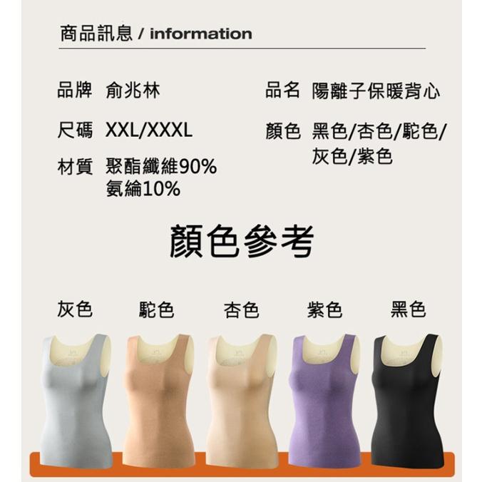 陽離子保暖背心 雙面絨貼片 無痕背心 保暖護腰,強效蓄熱 三層結構,蓄熱鎖溫科技 陽離子科技纖維 雙面磨毛,暖感加倍 陽離子保暖背心 雙面絨貼片 無痕背心 保暖背心 圓領背心 禦寒背心 打底背心 加絨背心 商品特色 保暖護腰,強效蓄熱 三層結構,蓄熱鎖溫科技 陽離子科技纖維 雙面磨毛,暖感加倍 腰腹部加智能溫感貼片 U型領口,無痕服貼 商品規格 品牌:俞兆林 品名:陽離子保暖背心 尺碼:2XL(胸圍100CM/65公斤以下適穿)衣寬36.5cm衣長60cm 3XL(胸圍105CM/65-80公斤適穿)衣寬38.5cm衣長61cm 顏色:黑色/杏色 材質:背心-聚酯纖維、氨綸/貼片-聚酯纖維、氨綸、黏纖、桑蠶絲 包裝尺寸:20.5x26.5x1.5cm 產地:中國 尺寸選擇建議(衣物略有彈性) ●2XL建議正常尺寸L以下可穿 (L尺寸穿合身不緊身/M尺寸穿合身有點寬鬆/S尺寸穿寬鬆) ●3XL建議正常尺寸XL可穿 (XL尺寸穿合身不緊身) 洗滌方式: 1.30度溫和洗,若欲使用洗衣機洗滌,建議放入洗衣袋較能維持商品的完整性。 2.不可烘乾易造成衣服縮水。 3.不可熨燙,使用懸掛晾乾。 4.含有漂白溶劑的洗劑會使美衣褪色,請避免使用。 5.初次清洗時多少會有掉色現象,建議將深、淺色衣料分開洗滌。 商品保固 基於保障消費者個人衛生,貼身衣物僅受理全新狀態(吊牌未拆、未下水、無污損、包裝及配件完整無缺)之退/換貨,如為商品本身暇疵,接受七日內退/換貨,瑕疵品請勿試穿,謝謝您。