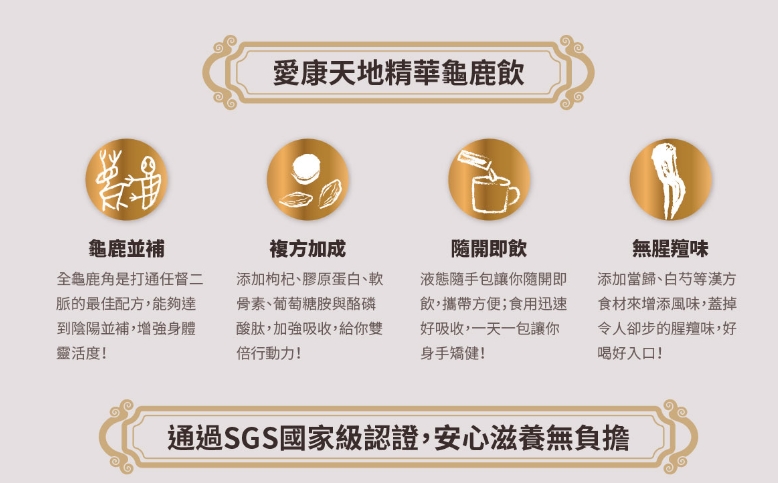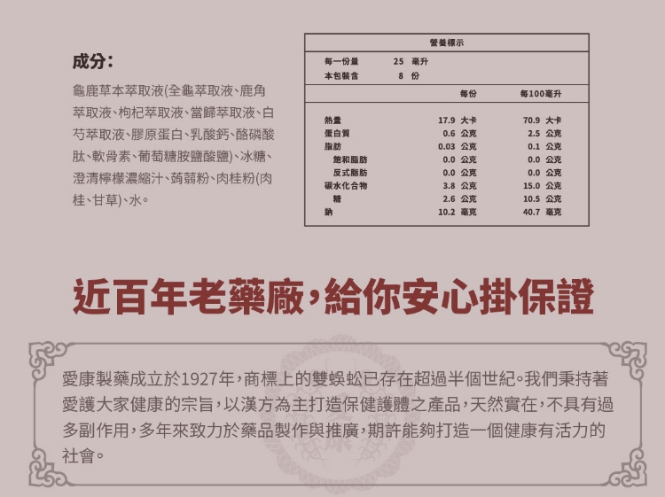 成分;全龜萃取液.鹿角萃取液.枸杞萃取液 .當歸萃取液.白芍萃取液.膠原蛋白.乳酸鈣.酪磷酸肽.軟骨素.葡萄糖胺鹽酸鹽.冰糖.澄清檸檬濃縮汁.蒟蒻粉.肉桂粉(肉桂 甘草).水