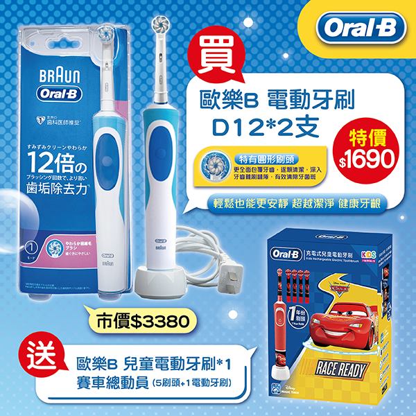 歐樂B-D12電動牙刷*2支 買就送 歐樂B兒童充電式電動牙刷優惠組(1電動牙刷+5刷頭)