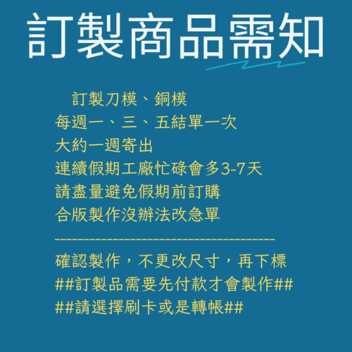 訂製商品 不論是刀模樣式、銅模樣式、模具或是手壓台,只要是訂製商品,無法當三日內出貨這裡下標 https://s-cf-tw.shopeesz.com/file/tw-11134208-7rbk2-m793joq97ole64 https://s-cf-tw.shopeesz.com/file/tw-11134208-7rbk0-m793joq9935u1e https://s-cf-tw.shopeesz.com/file/tw-11134208-7rbkd-m793joq9ahqa48 https://s-cf-tw.shopeesz.com/file/tw-11134208-7rbk3-m793joq9bwaq4b