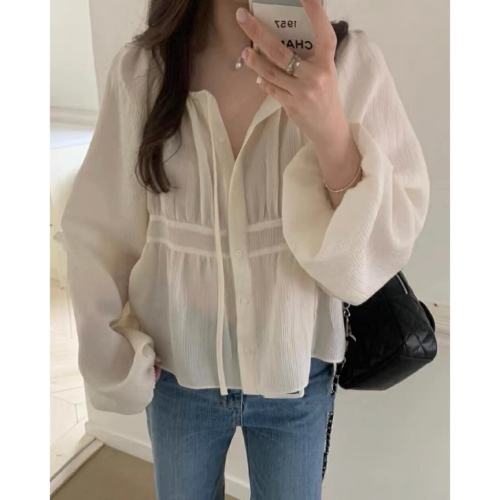 【YUNA유나】平價區TW000148-獨家~仙氣細摺壓紋縮腰綁帶襯衫