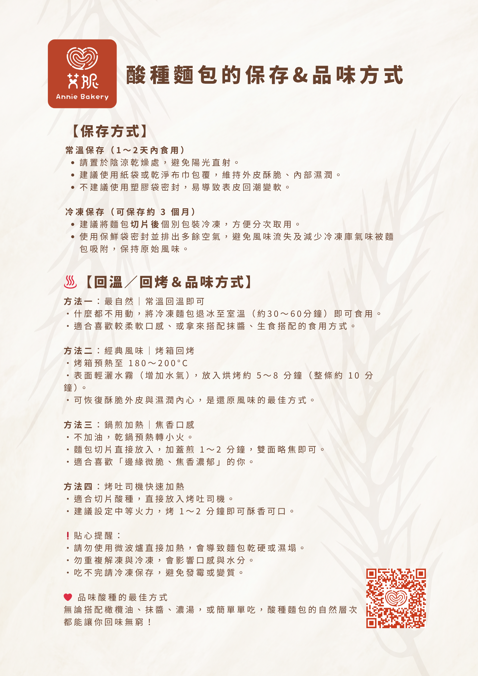 說明:不使用市售酵母,只用自養的天然菌種自然發酵,過程中可分解部分植酸與麩質結構,對腸胃敏感或麩質耐受性較低的人,可能更容易消化。這也是許多注重飲食健康者愛上酸種的原因之一。