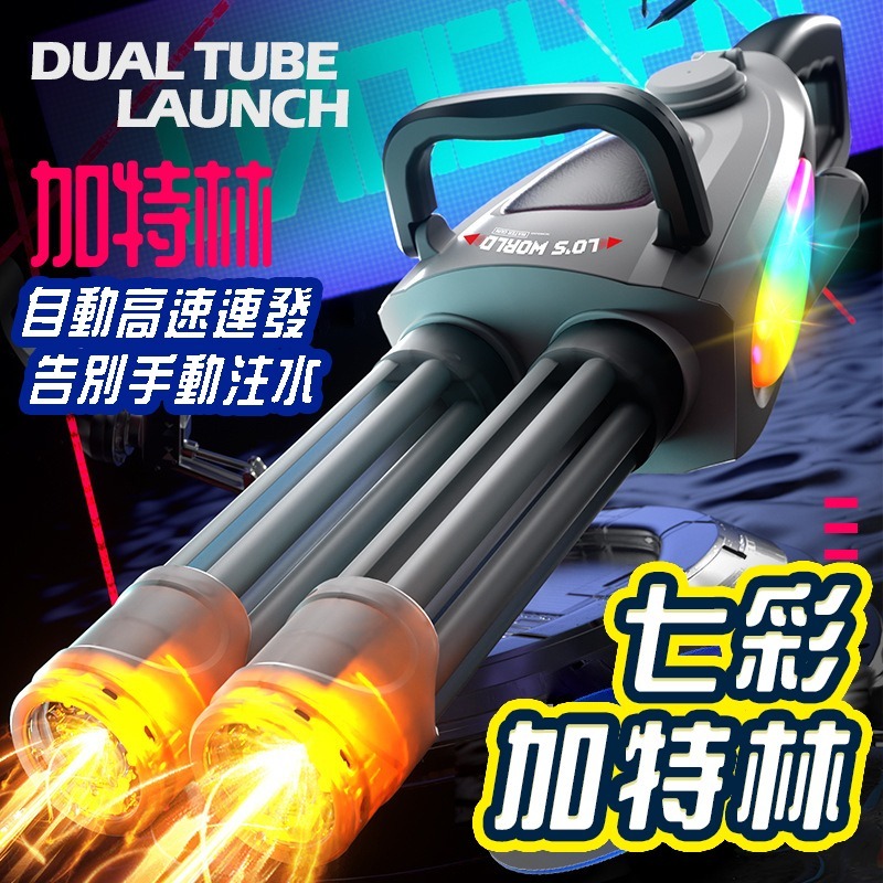 🚀 七彩加特林電動水槍|雙管連發|炫彩燈光|超遠射程8-10米|霸氣手持|外接水瓶大容量