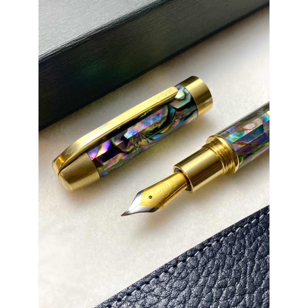 大鵬灣(DAPENG BAY):3952老山羊-以台灣知名特色景點命名,大器書寫特別款。採用手工製鮑魚貝殼材質再一片一片再組合拼接,盡其可能接續每片的紋路。貝殼片都有天然的紋路及其天然的色彩,人工拋光後包覆在銅管上,再上一層厚厚的透明漆,可看得出接線但摸不到接線。天然紋路、五彩繽紛、絢麗奪目,美不勝收(自然紋路,優質隨機出貨)。筆款搭配原黃銅車製配件(原銅未電鍍),旋轉式氣密筆蓋及特製彈性機構筆夾設計,喜歡原銅風味搭配的筆友不可錯過!