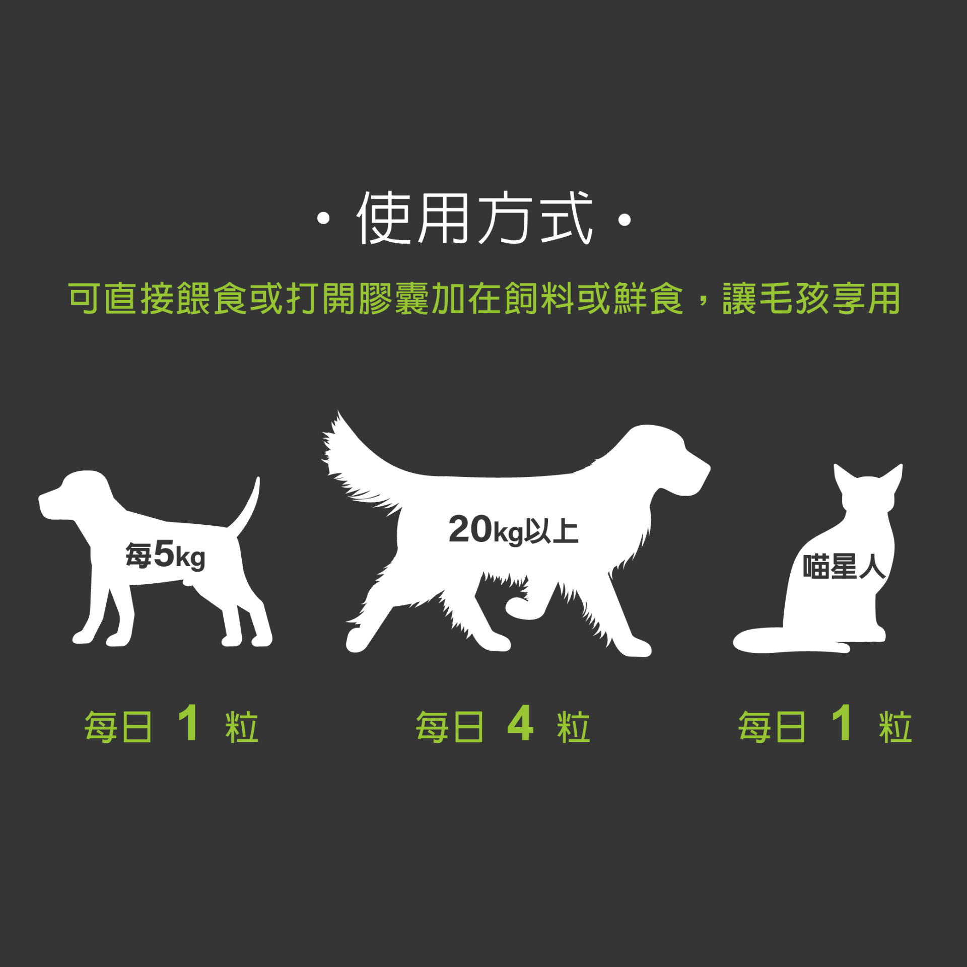 膠囊直接吃或打開將粉末拌入飼料或罐頭一起食用