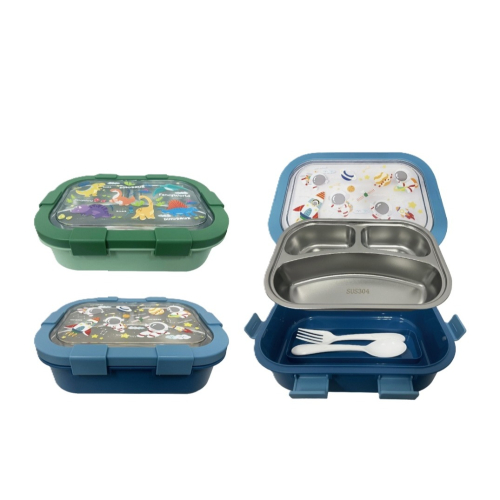 Q特304不鏽鋼 三格隔熱餐盒 (附叉匙) 太空人/恐龍 4710446399700