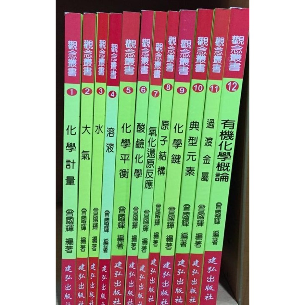 如需單本 可在問與答提問!建弘 高中 化學觀念叢書 書目 (共十二冊) 作者:曾國輝1.化學計量2.大氣3.水4.溶液5.化學平衡6.酸鹼平衡7.氧化還原反應8.原子結構9.化學鍵10.典型元素11.過度金屬12.有機化學概論