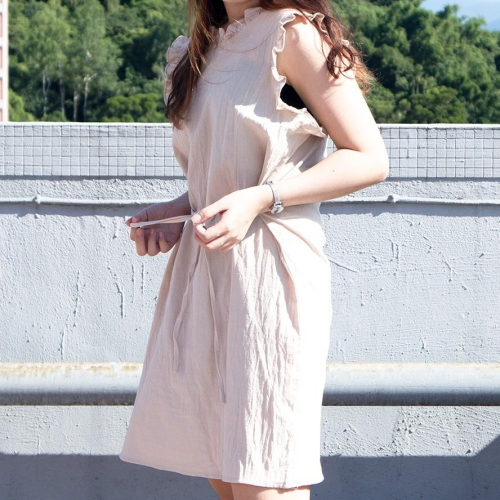 RayRayStephanie 棉麻木耳邊無袖綁帶連身裙(杏)