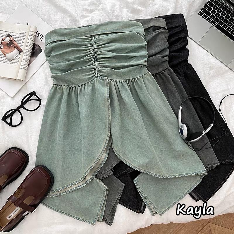現貨+預購🌟免運🌟 牛仔抓皺顯瘦不規則平口上衣 A1226 #Kayla.girl #少女愷拉