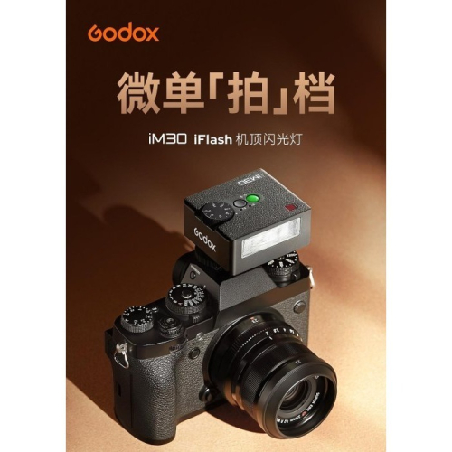 Godox神牛全新機頂閃光燈iM30,一款可隨身放在口袋或裝在相機上的迷你閃光燈,無論何時何地,皆能輕巧相伴。搭配7檔13級調光(1/64~1/1)、GN15閃光指數、優異光效、便利供電等諸多特性,協助您突破光線束縛,自由創作。