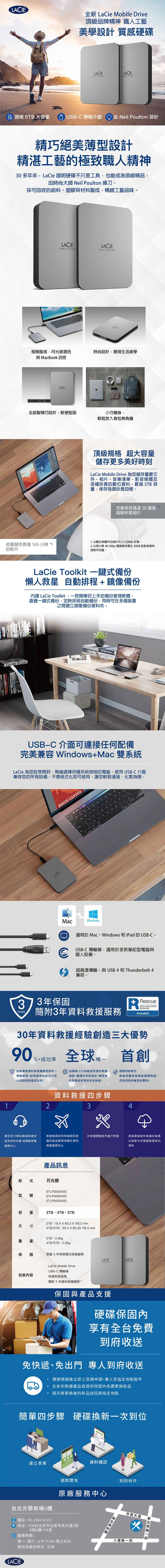 ●包裝內容: LaCie Mobile Drive USB-C 傳輸線 快速安裝指南 隨附 3 年資料救援服務