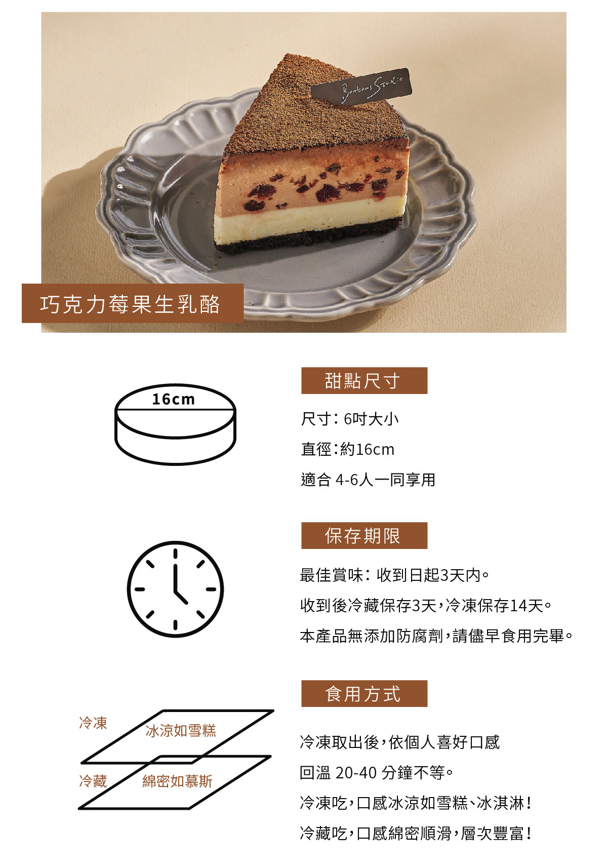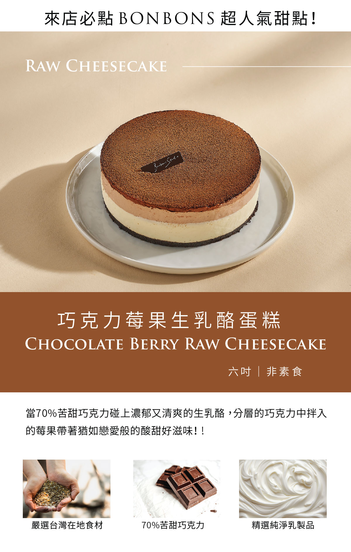當70%苦甜巧克力碰上濃郁又清爽的生乳酪 ,分層的巧克力中拌入的莓果帶著猶如戀愛般的酸甜好滋味