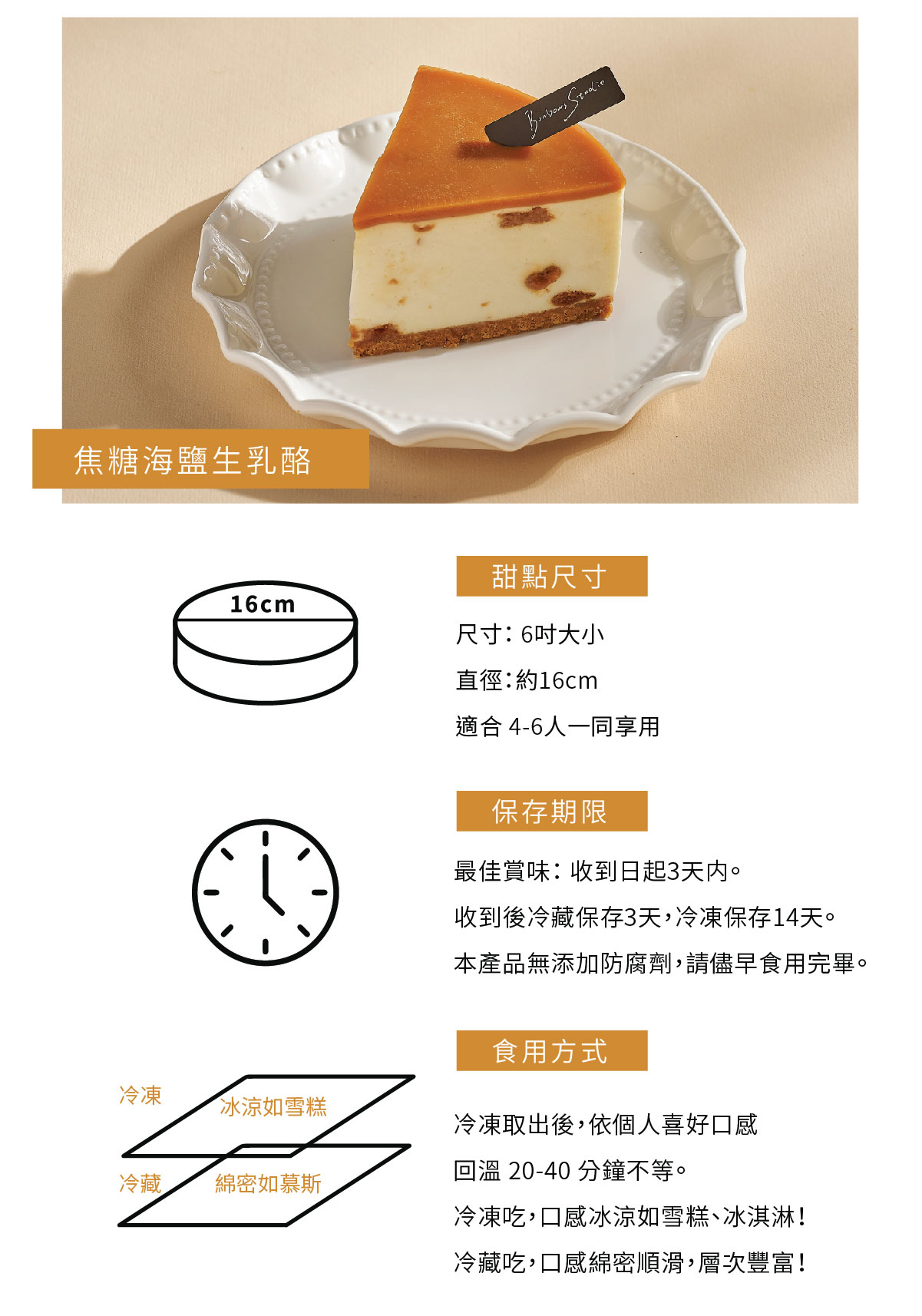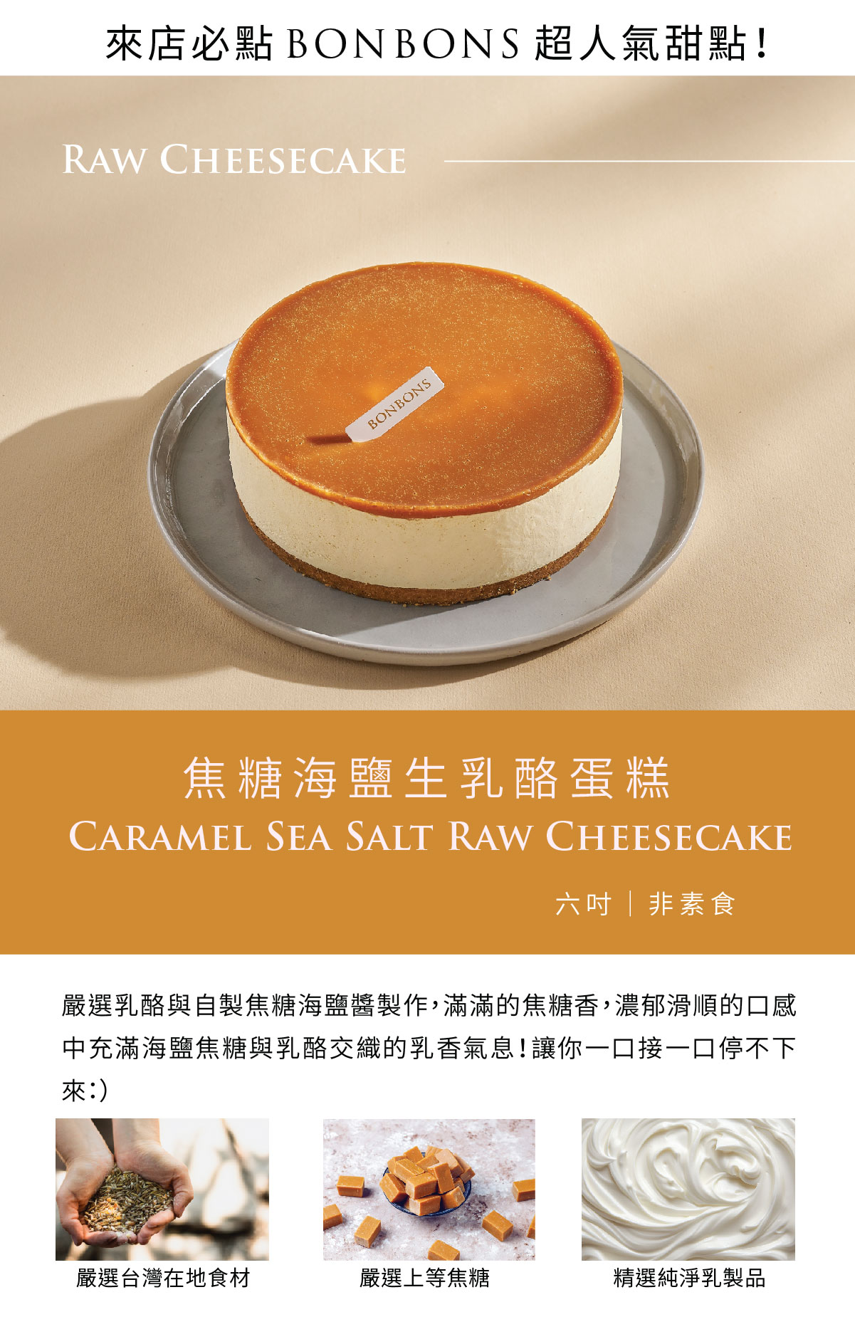 嚴選乳酪與自製焦糖海鹽醬製作,滿滿的焦糖香,濃郁滑順的口感中充滿海鹽焦糖與乳酪交織的乳香氣息!讓你一口接一口停不下來:)