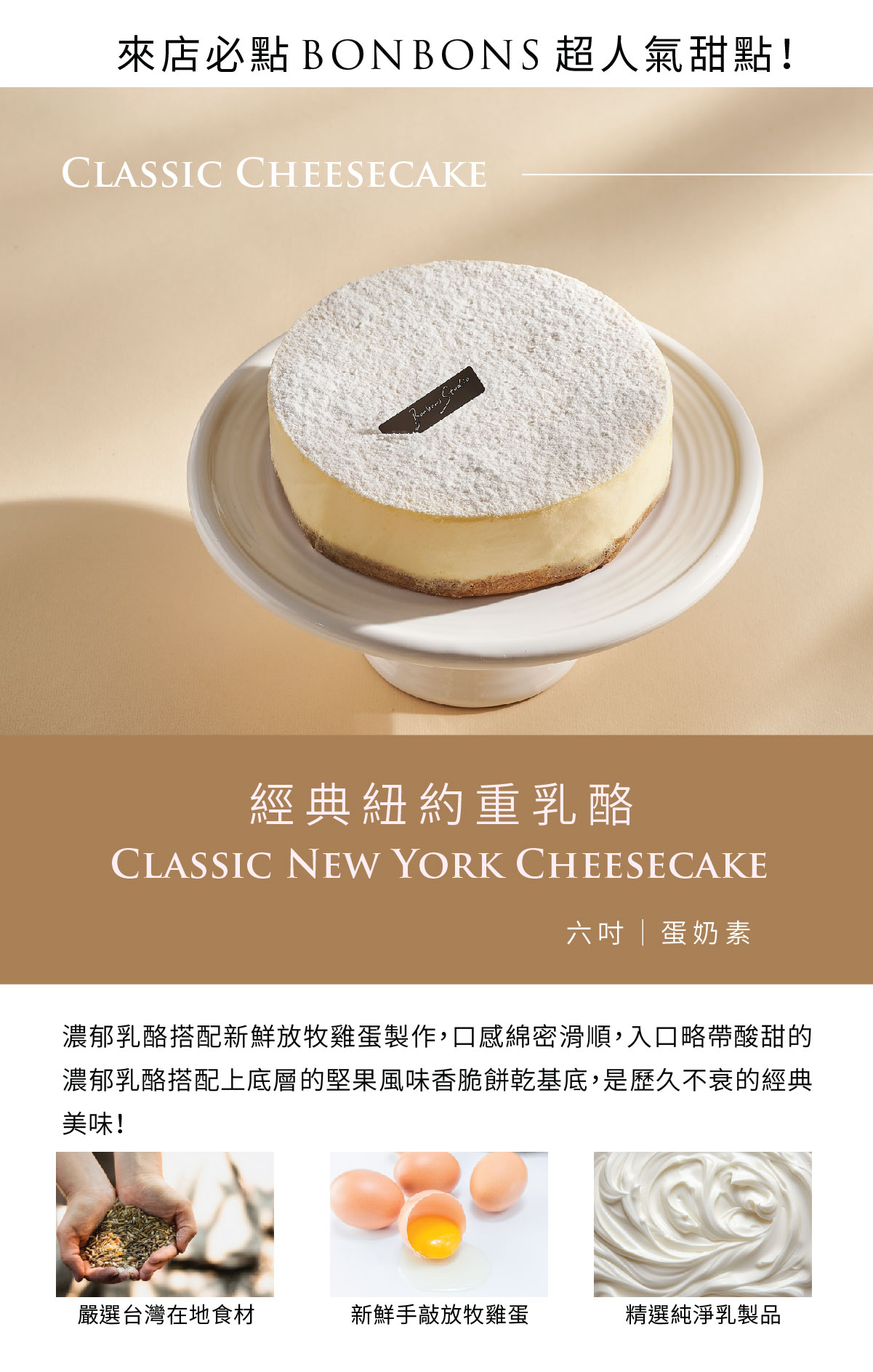 濃郁乳酪搭配新鮮放牧雞蛋製作,口感綿密滑順,入口略帶酸甜的濃郁乳酪搭配上底層的堅果風味香脆餅乾基底,是歷久不衰的經典美味!